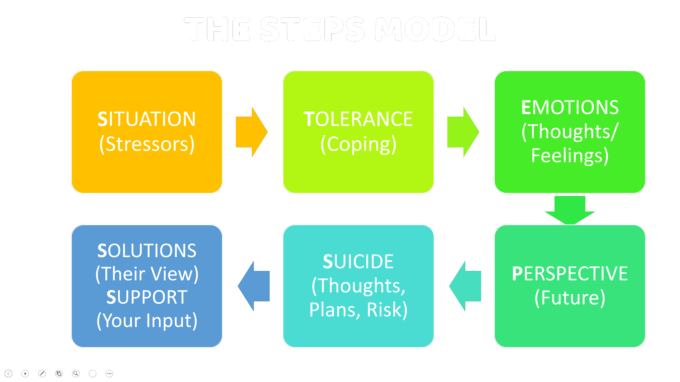 As mentioned above, STEPS is a pneumonic. Each letter represents a stage in the suicide conversation, with the final letter standing for not one, but three elements.